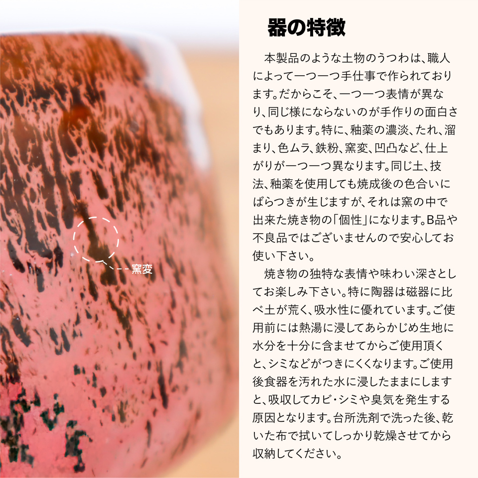 ・焼き物の性質上、鉄粉、色ムラ、釉垂れ、ピンホール、小キズ、多少のゆがみが発生する場合がございますが、 不良品ではございません。またご使用上の問題はございませんので、ご安心ください。