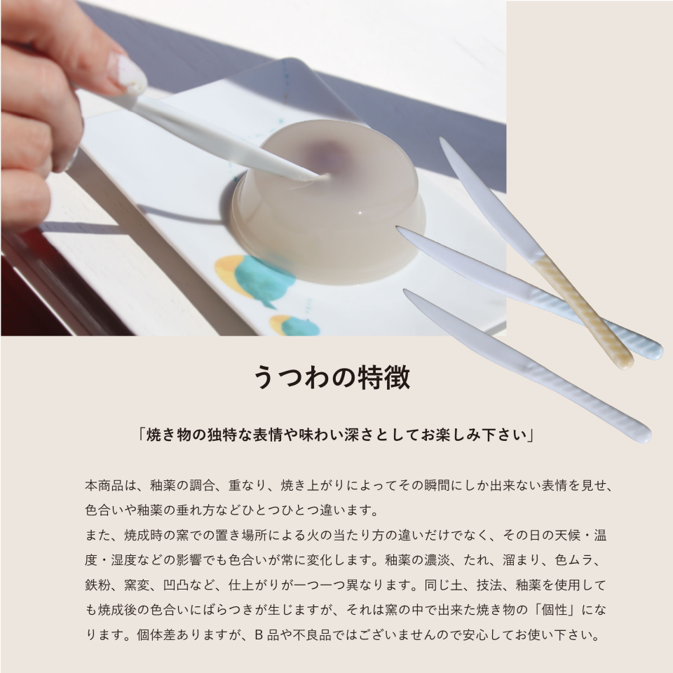 ・焼き物の性質上、鉄粉、色ムラ、釉垂れ、ピンホール、小キズ、多少のゆがみが発生する場合がございますが、 不良品ではございません。またご使用上の問題はございませんので、ご安心ください。