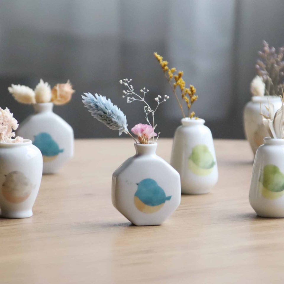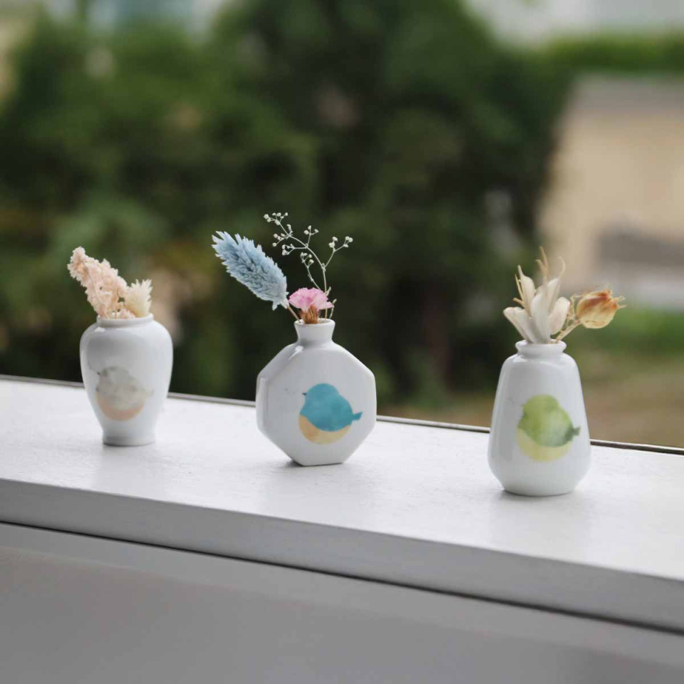 淡く澄んだsuisaiの鳥たち。色とりどりのコトリたちを集めてうつわになりました。