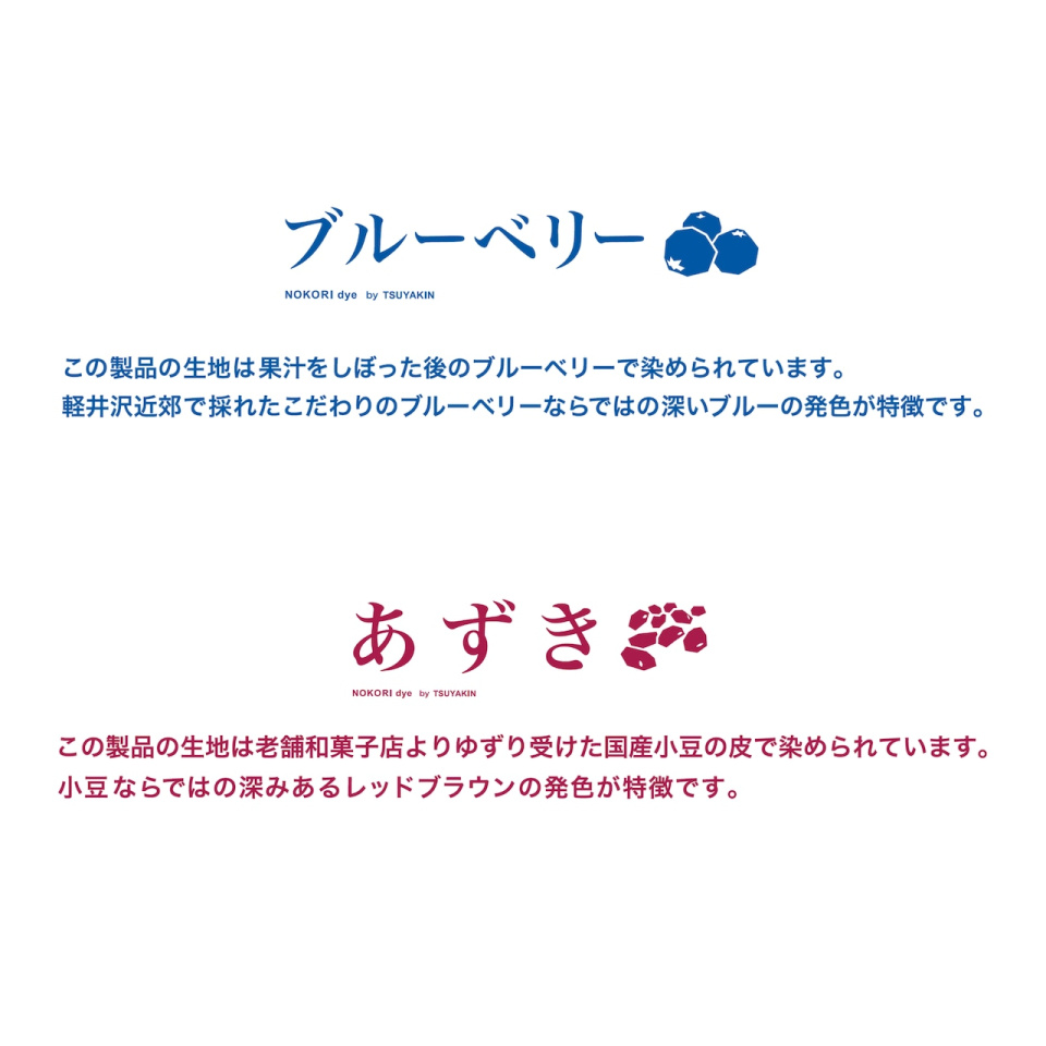 この製品の生地は果汁をしぼった後のブルーベリーで染められています。軽井沢近郊で採れたこだわりのブルーベリーならではの深いブルーの発色が特徴です。