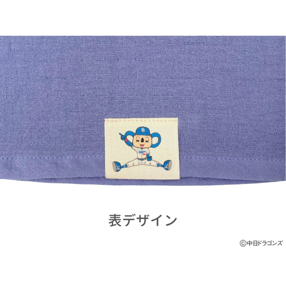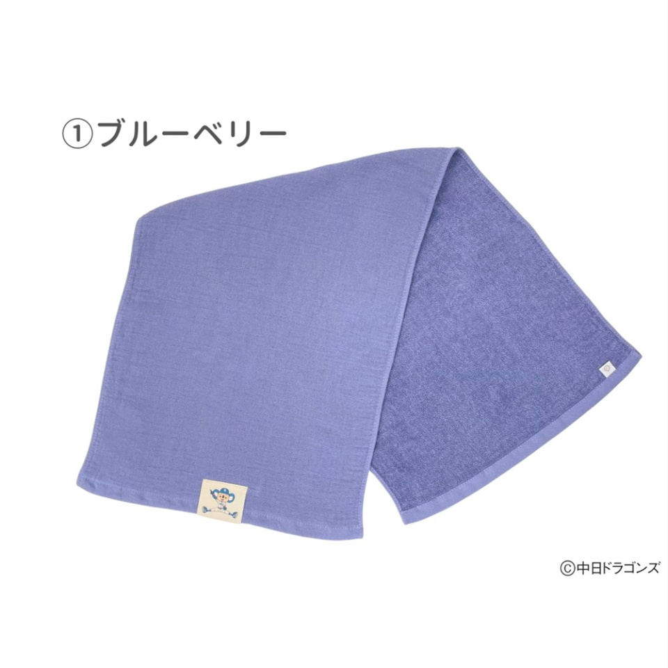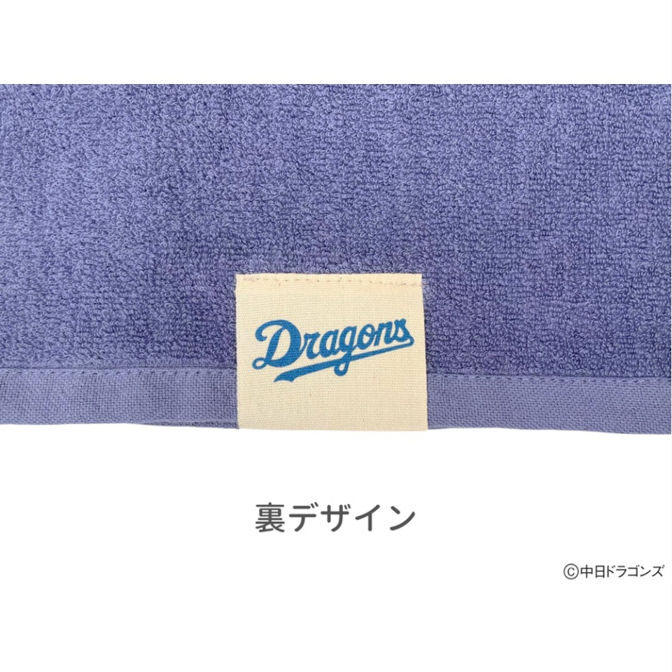 「ブルーベリーカラー」表にドアラさん、裏にドラゴンズロゴがプリントされたコットンテープをタオルの端に縫い付けてあります。