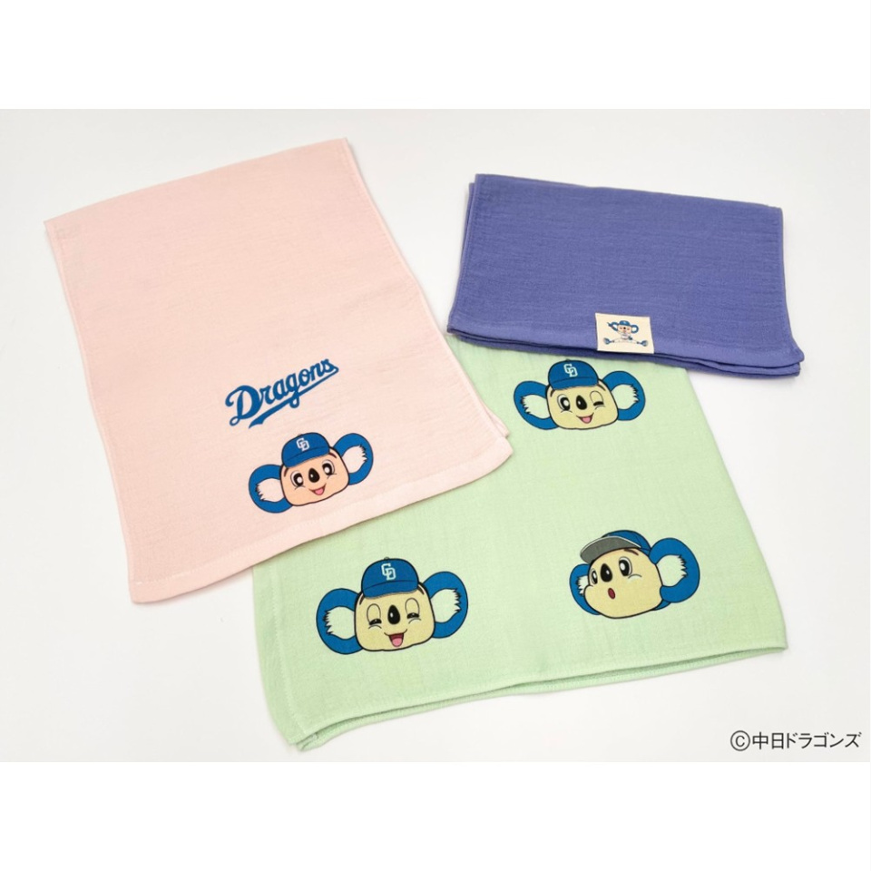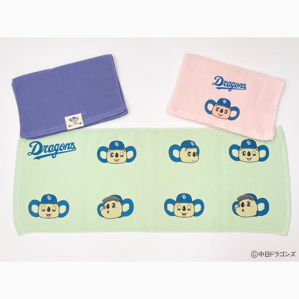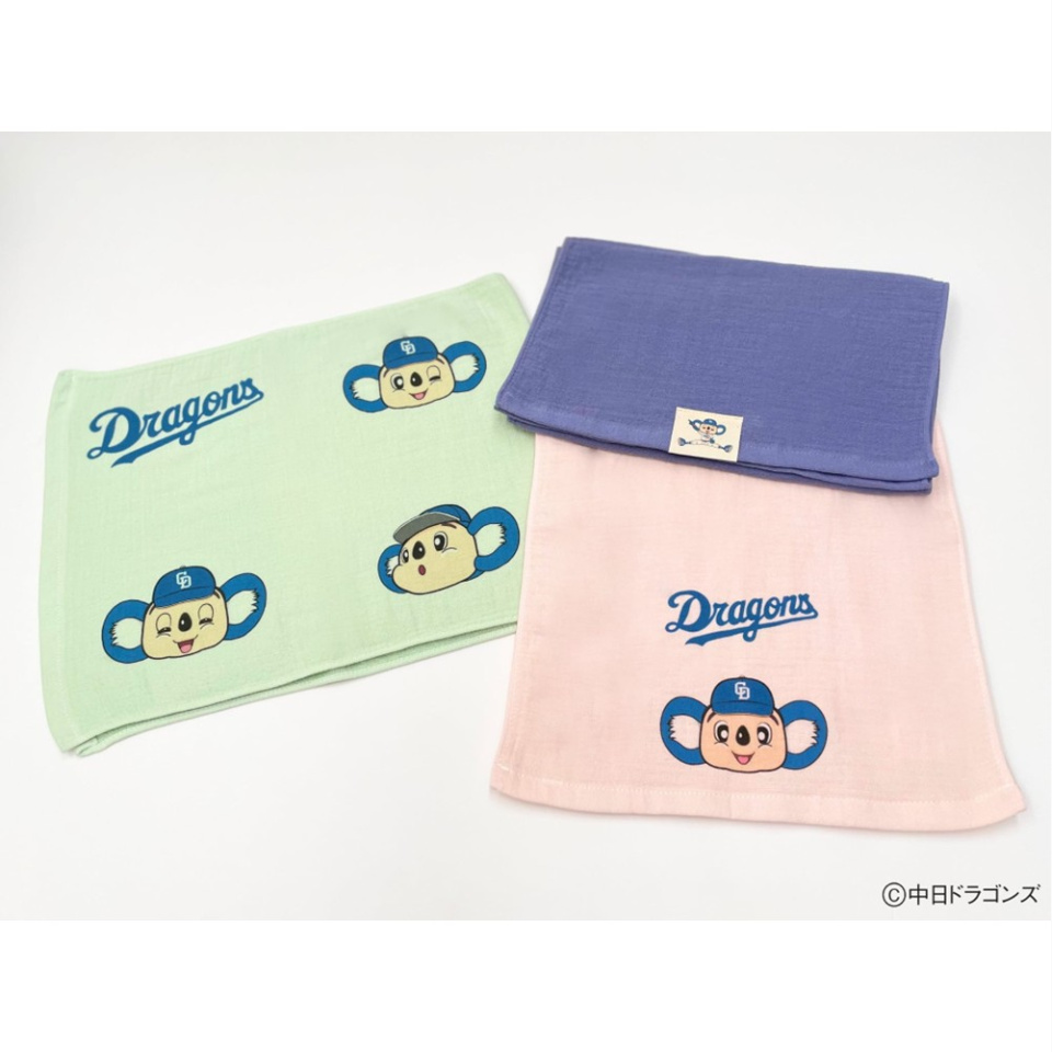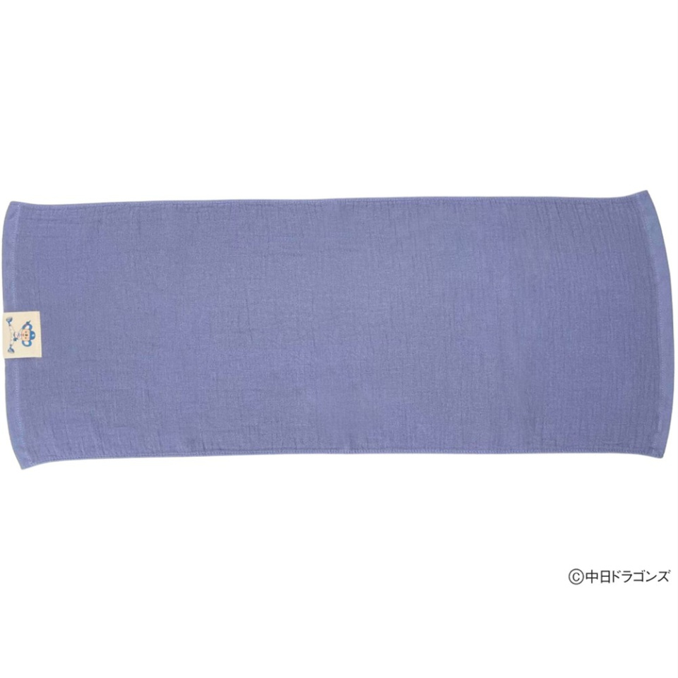 「ブルーベリーカラー」表にドアラさん、裏にドラゴンズロゴがプリントされたコットンテープをタオルの端に縫い付けてあります。