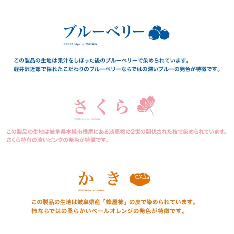 この製品の生地は岐阜県産「蜂屋柿」の皮で染められています。柿ならではの柔らかいペールオレンジの発色が特徴です。