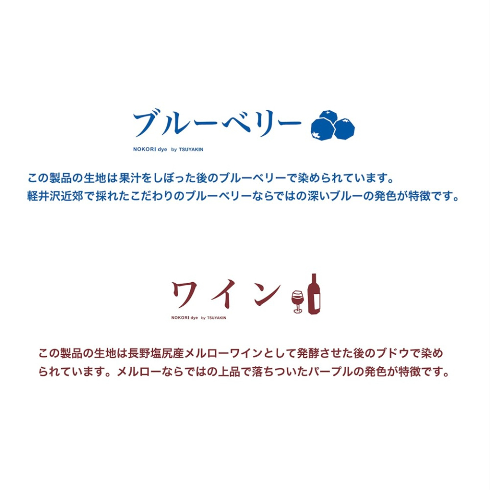 この製品の生地は果汁をしぼった後のブルーベリーで染められています。軽井沢近郊で採れたこだわりのブルーベリーならではの深いブルーの発色が特徴です。