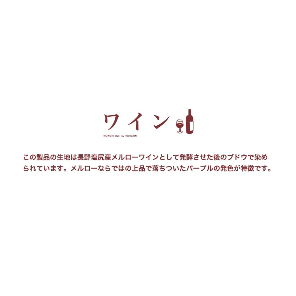 この製品の生地は長野塩尻産メルローワインとして発酵させた後のブドウで染められています。メルローならではの上品で落ち着いたパープルの発色が特徴です。