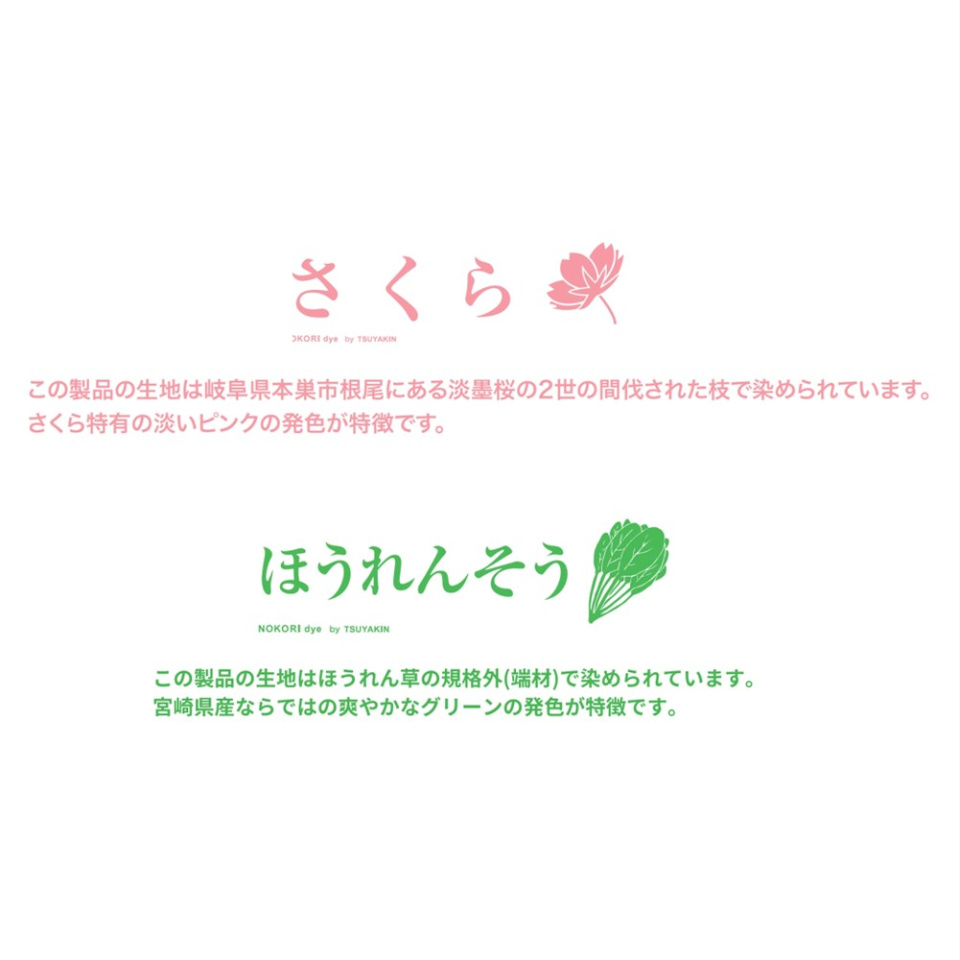 この製品の生地はほうれん草の規格外(端材)で染められています。宮崎県産ならではの爽やかなグリーンの発色が特徴です。