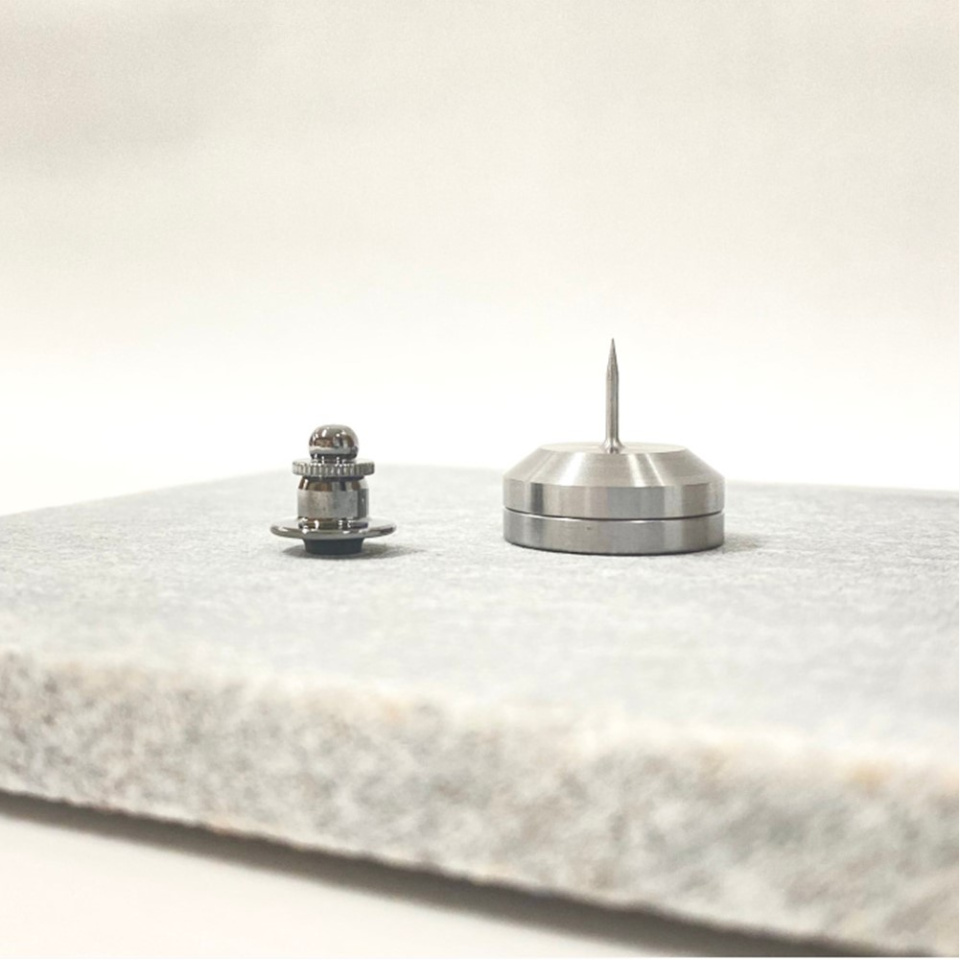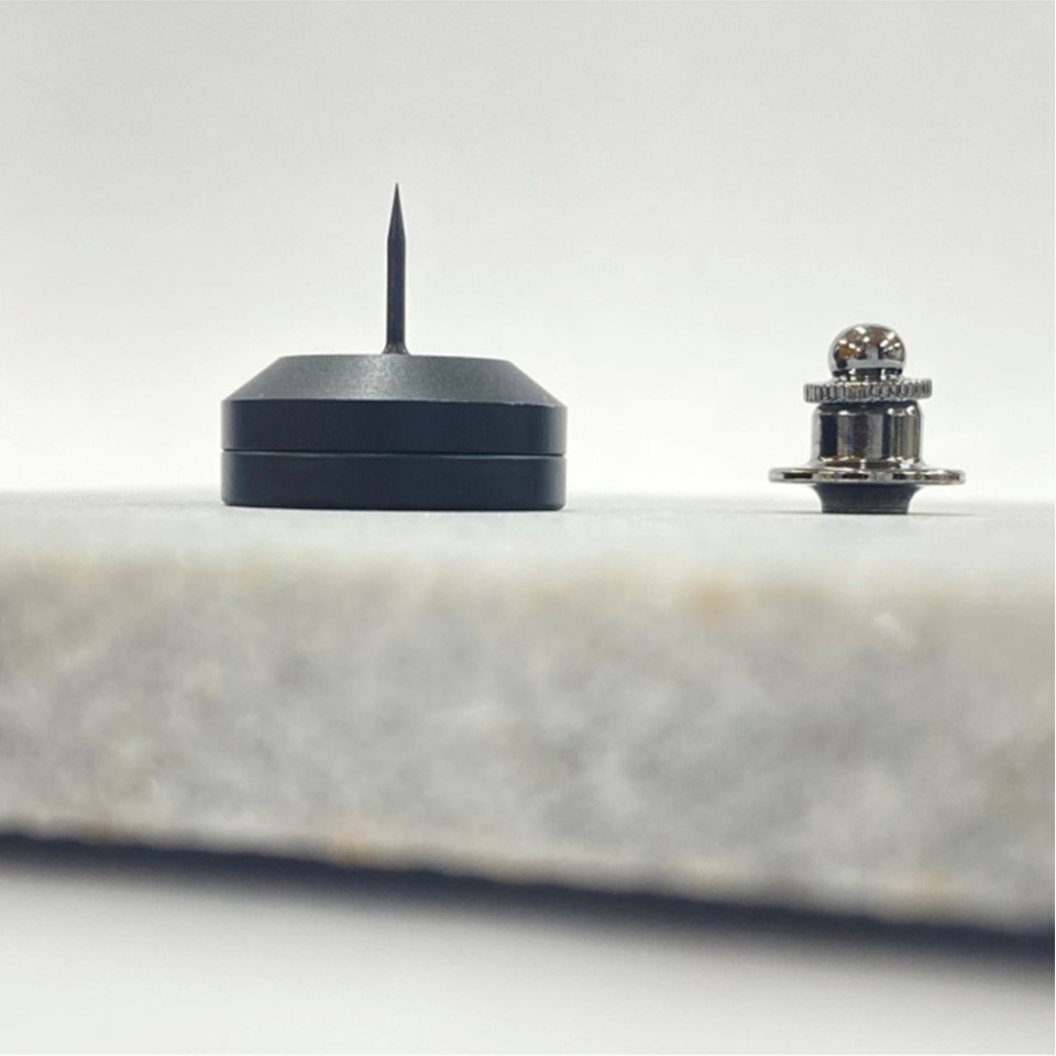 こちらのピンズは、旋盤加工という加工方法でアルミニウムを丹精に針先まで削り出し、職人が一つひとつ丁寧に仕上げております。