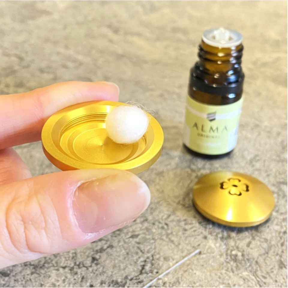 ③香りを染み込ませたコットンをピンズの内側へセッティングし蓋を閉めます。