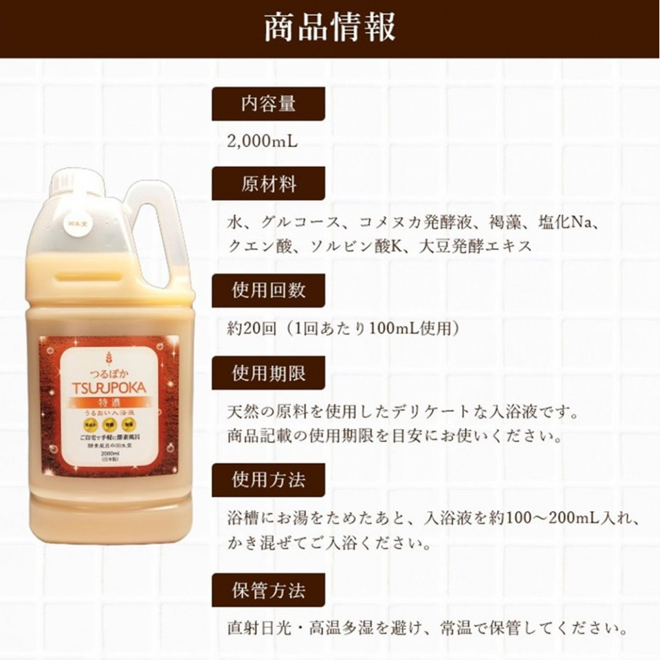 『つるぽか』は国産の栄養豊富な米ぬかと昆布を使用し、独自の発酵製法で作られた酵素入浴液です。