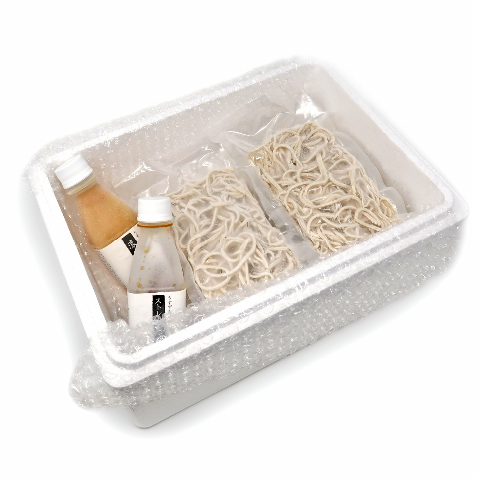 ②麺を流水またはお湯にて解凍いただいた後、つゆとは別の鍋で麺を温めてから器に盛り、別鍋で温めたつゆをかけて、お召し上がりください。