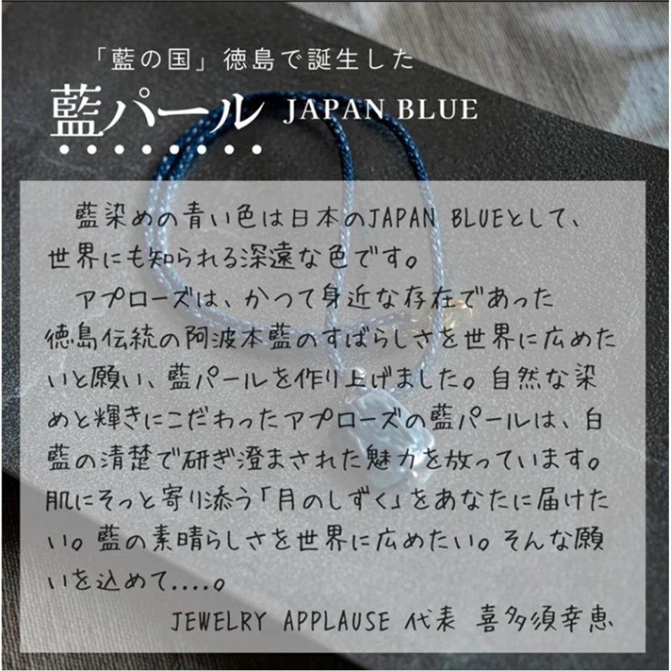 実店舗でのジュエリー販売を開始して今年で29年。 藍パールをはじめ、ジュエリーアプローズオリジナルジュエリーを心を込めてお届けしております。 【藍パールについて】 ジュエリーアプローズは日本一の藍の産地である徳島県で作られた、『天然阿波本藍染』と、『伝統技術』によって、世界でたったひとつの宝石〖藍パール〗を生み出しました。 「世界で唯一のあなたと、あなたの大切な人のために、一つひとつ愛を込めて」 皆様の世界にひとつだけの、ジュエリーライフのお手伝いは、ジュエリーアプローズにお任せください。誠心誠意ご対応させていただきます。 ご不明点やご質問など、お気軽にお問合せください。