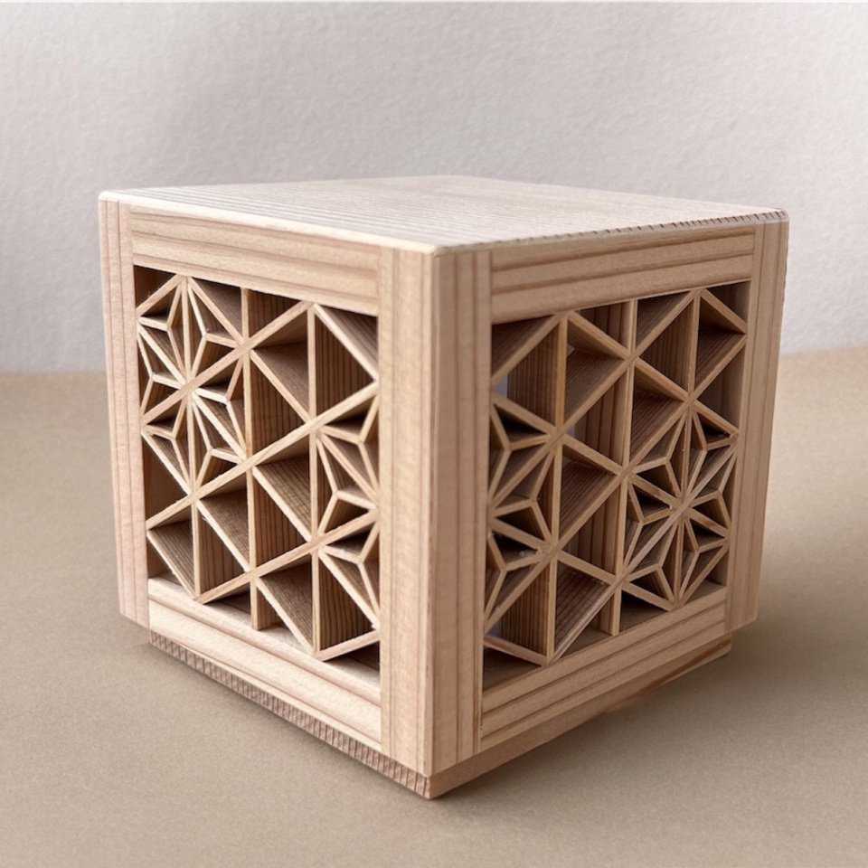 大湊文吉商店の組子細工は、組子を平面はもちろん、立体としても愉しもうという斬新な意匠と、苦心を重ねて完成した、「面の柄を断ち切らず連続させる技術」によって、未だかつてない、個性を放ちながらも現代の空間と調和する逸品を製作しております。