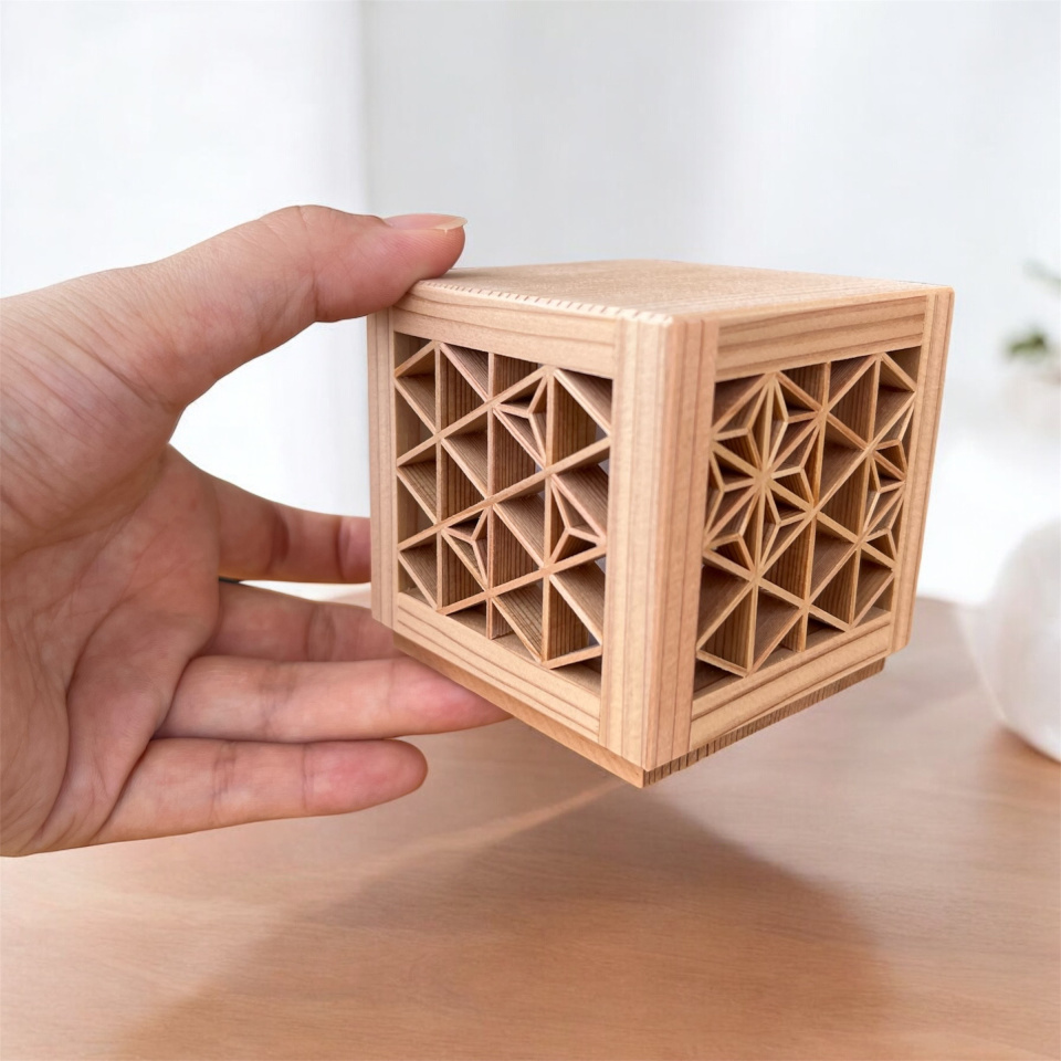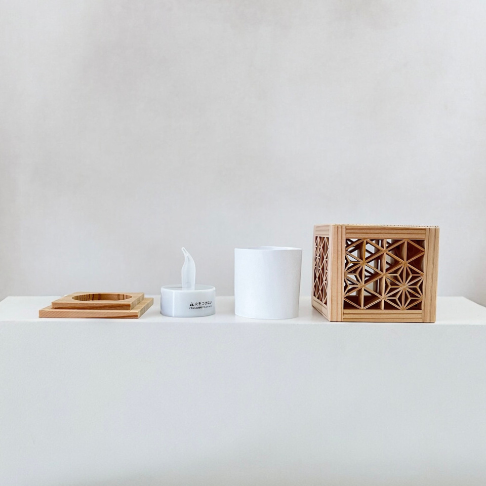 手のひらに乗せられるほど小さい、日本の伝統技法である組子細工の“灯り”です。