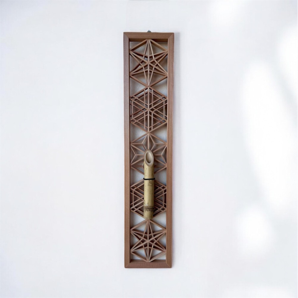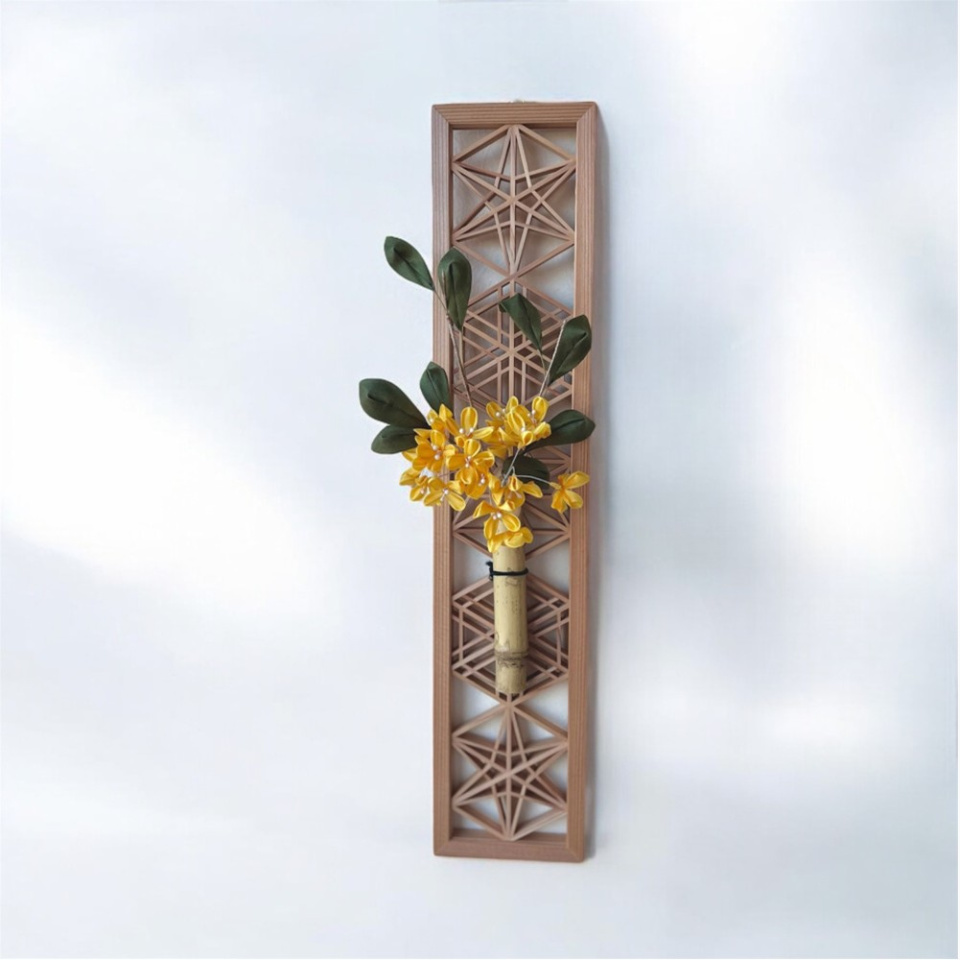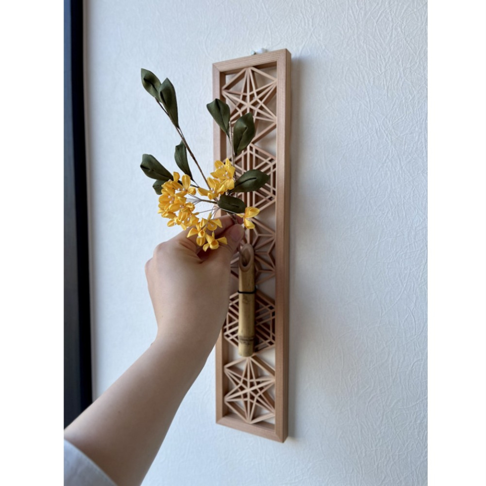 季節ごとに挿す植物を替えることで、1年中楽しむことができます。和のイメージが強い組子細工ですが、飾る植物によって和洋どちらのインテリアともよく合います。壁や柱に細い釘もしくは鋲を刺して飾れるように、金具を取り付けています。和室や廊下、玄関先、お手洗いなどお好きな場所でお使いください。