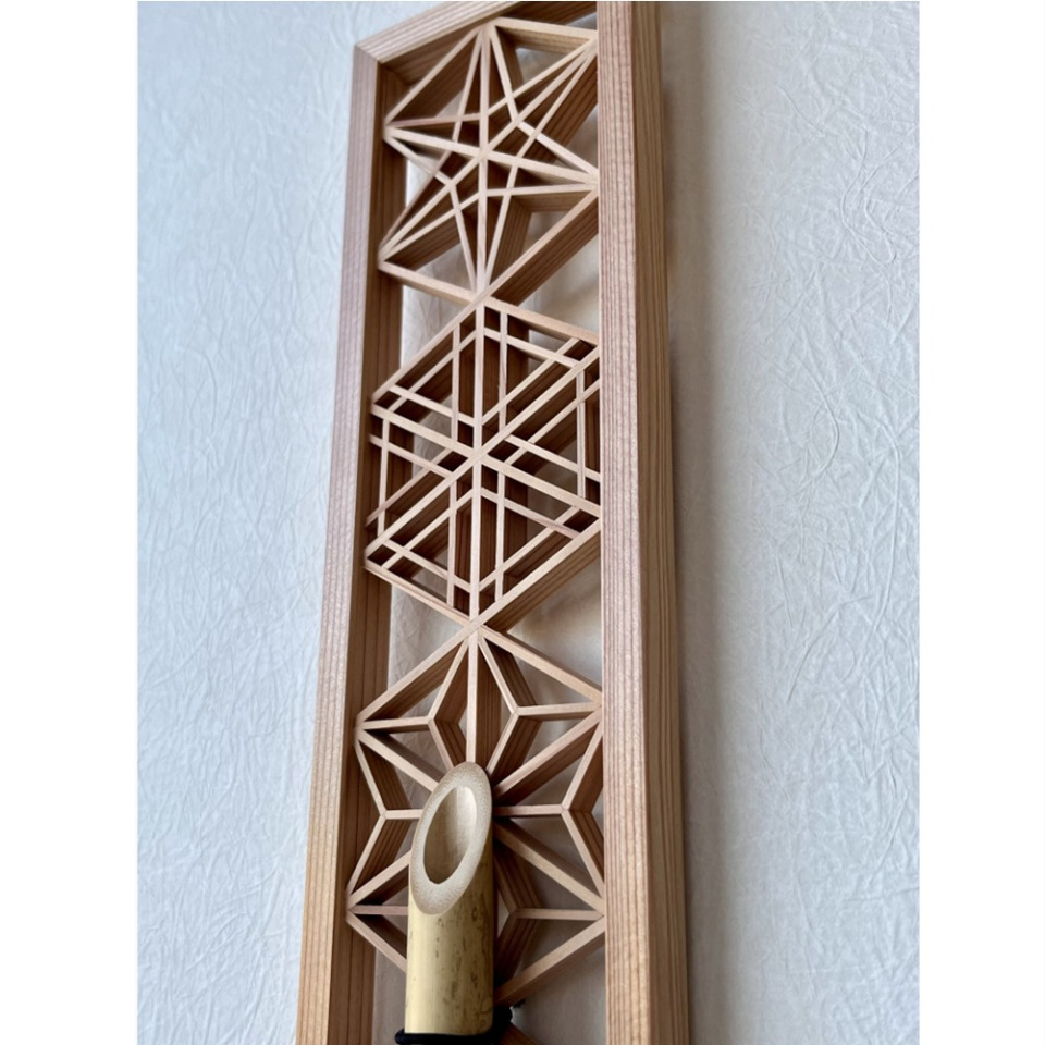 組子細工ではポピュラーな“竜胆(りんどう)・麻の葉・胡麻”の3種類の文様をあしらい、白竹(花器)を付属しています。文様の意味はそれぞれ、長寿・誠実を意味する“竜胆文様”、魔除けや子供の成長を願う“麻の葉文様”、長寿を願う“胡麻文様”です。