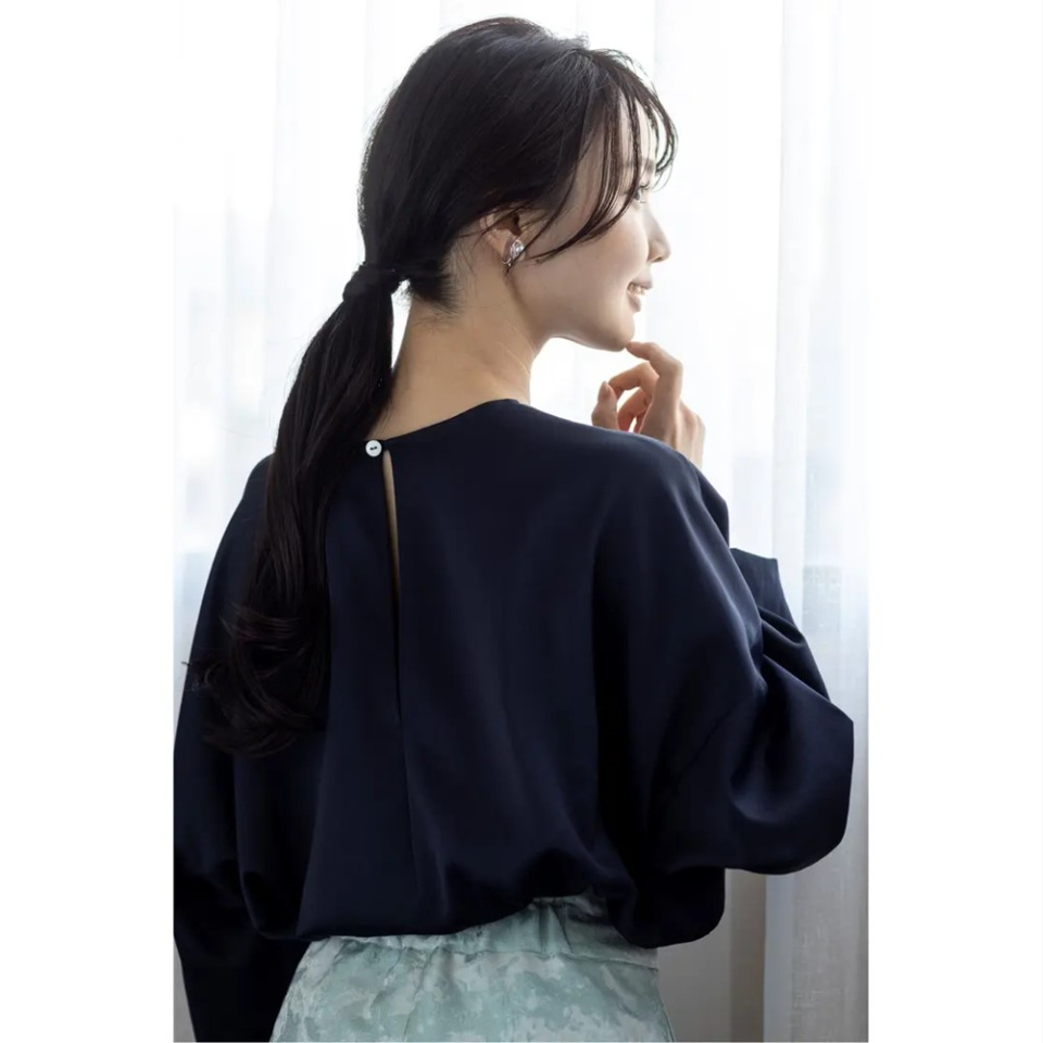 袖は女性らしいボリュームスリーブデザイン。袖口はゴム仕様のため手洗い時のストレスも軽減できます。