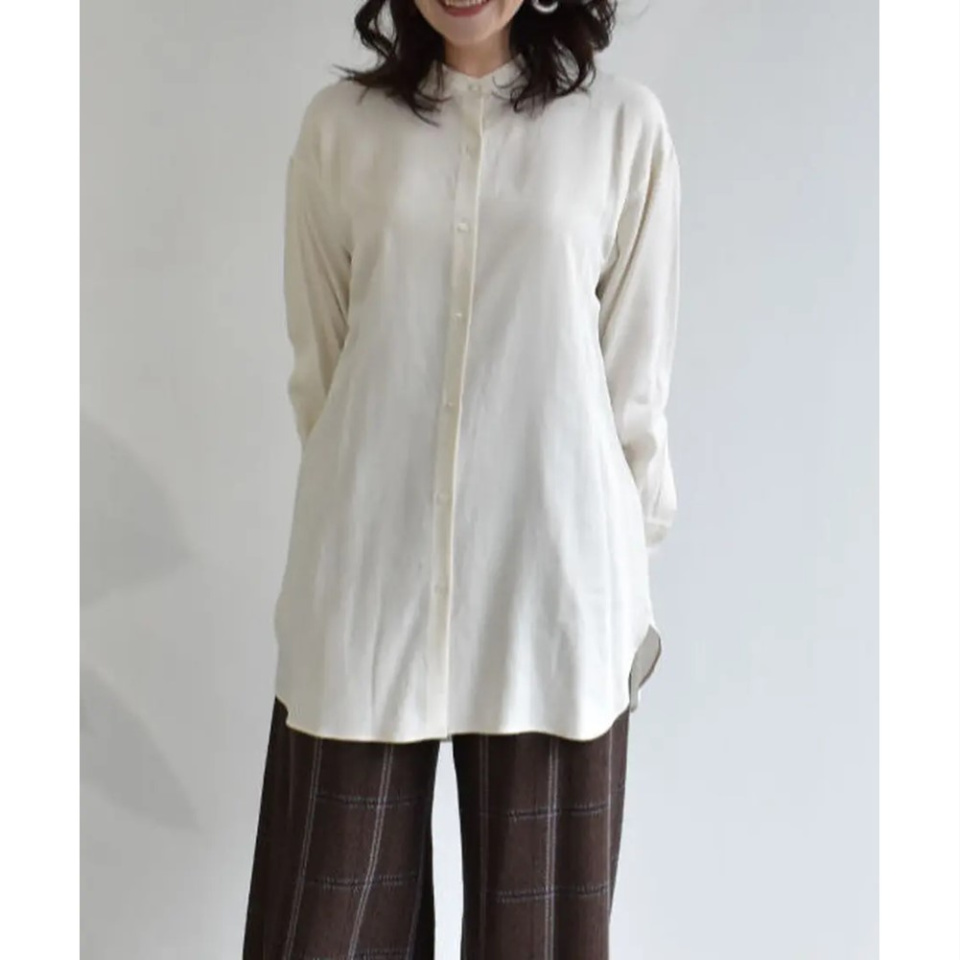 リヨセルならではの上品な光沢と落ち感が美しいバンドカラーシャツ。